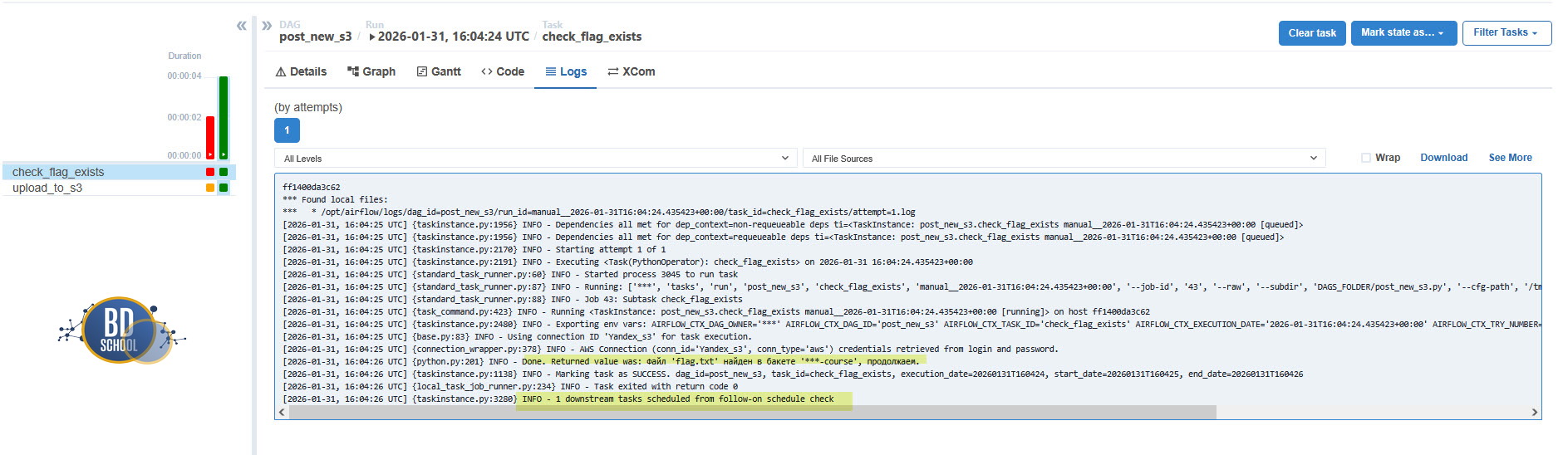- Лечение: Зайдите в консоль MinIO (localhost:9001) или Yandex Cloud и создайте бакет airflow-bucket вручную перед запуском DAG.